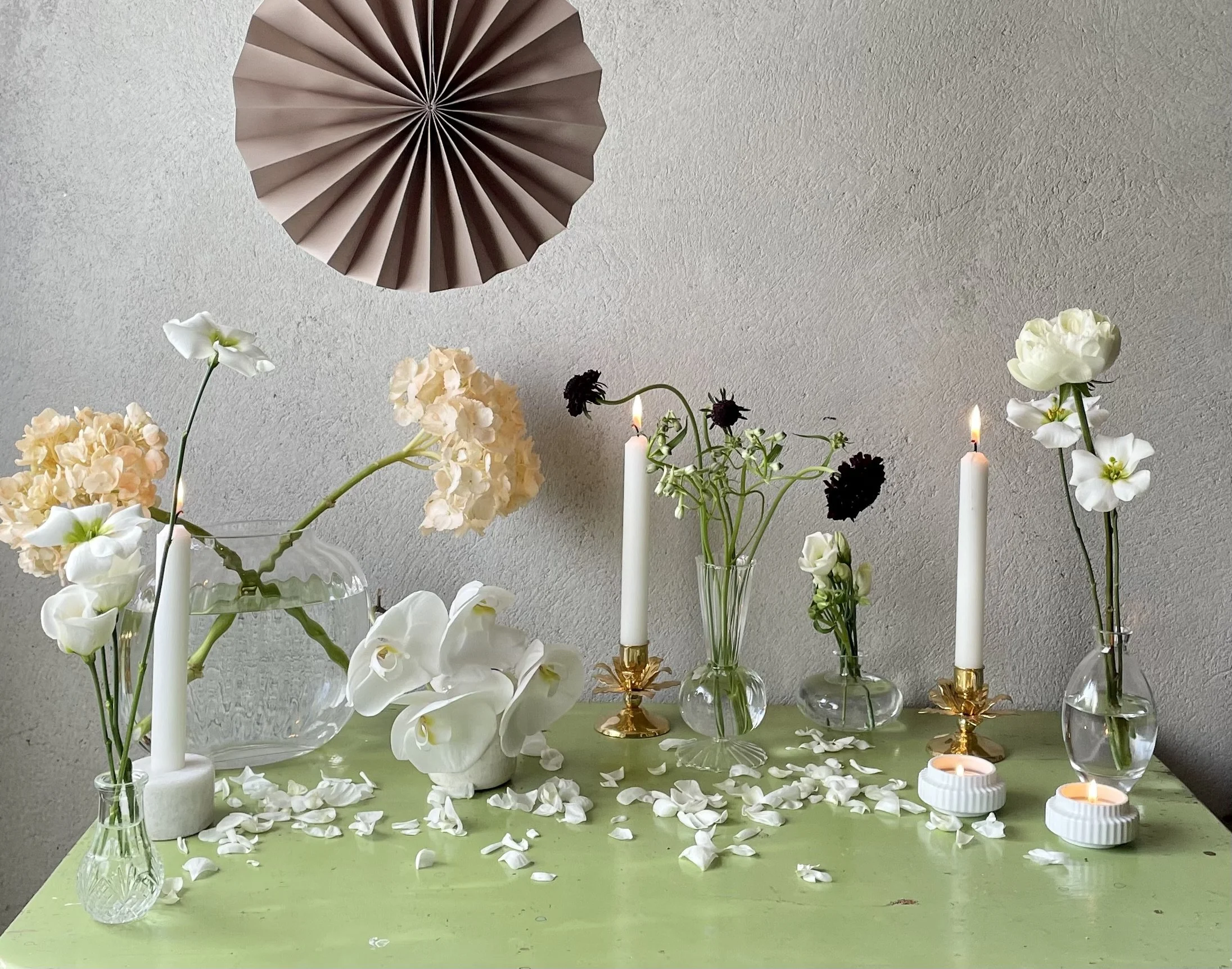 Det kan kanskje best oversettast til bordlandskap og er den perfekte måten å ta festbordet til neste nivå. Småvaser eller oppsatser, tente lys eller smålamper, uansett kva du ønsker så kan vi saman lage det perfekte bordet.