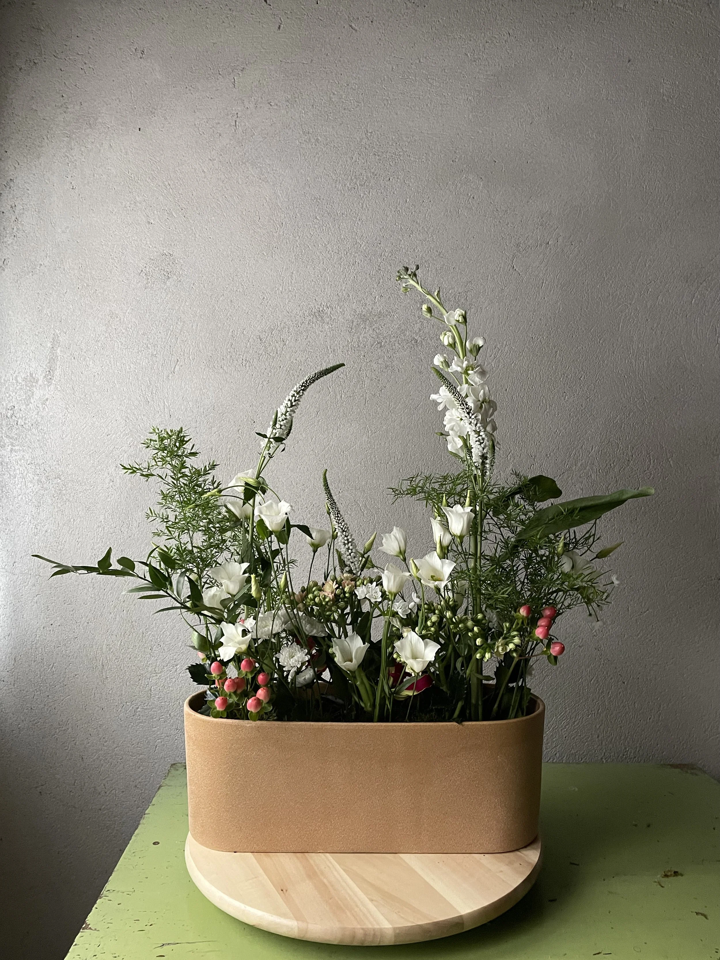 Ei blomstereng i ei plantekasse i keramikk, 40 cm. lang. Moglegheitene for blomsterdekorasjon er mange med denne løysinga og vil skape ei god atmosfære.